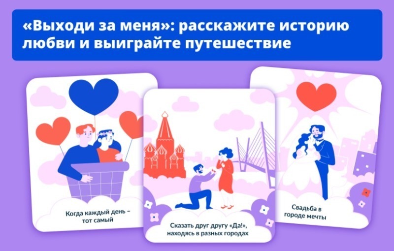 Принять участие могут как пары, готовящиеся к свадьбе, так и те, кто уже зарегистрировал брак или подал заявление в ЗАГС через «Госуслуги». Победители конкурса будут объявлены на сайте проекта выходизаменя.рф. Главный приз — романтическое путешествие по России.